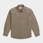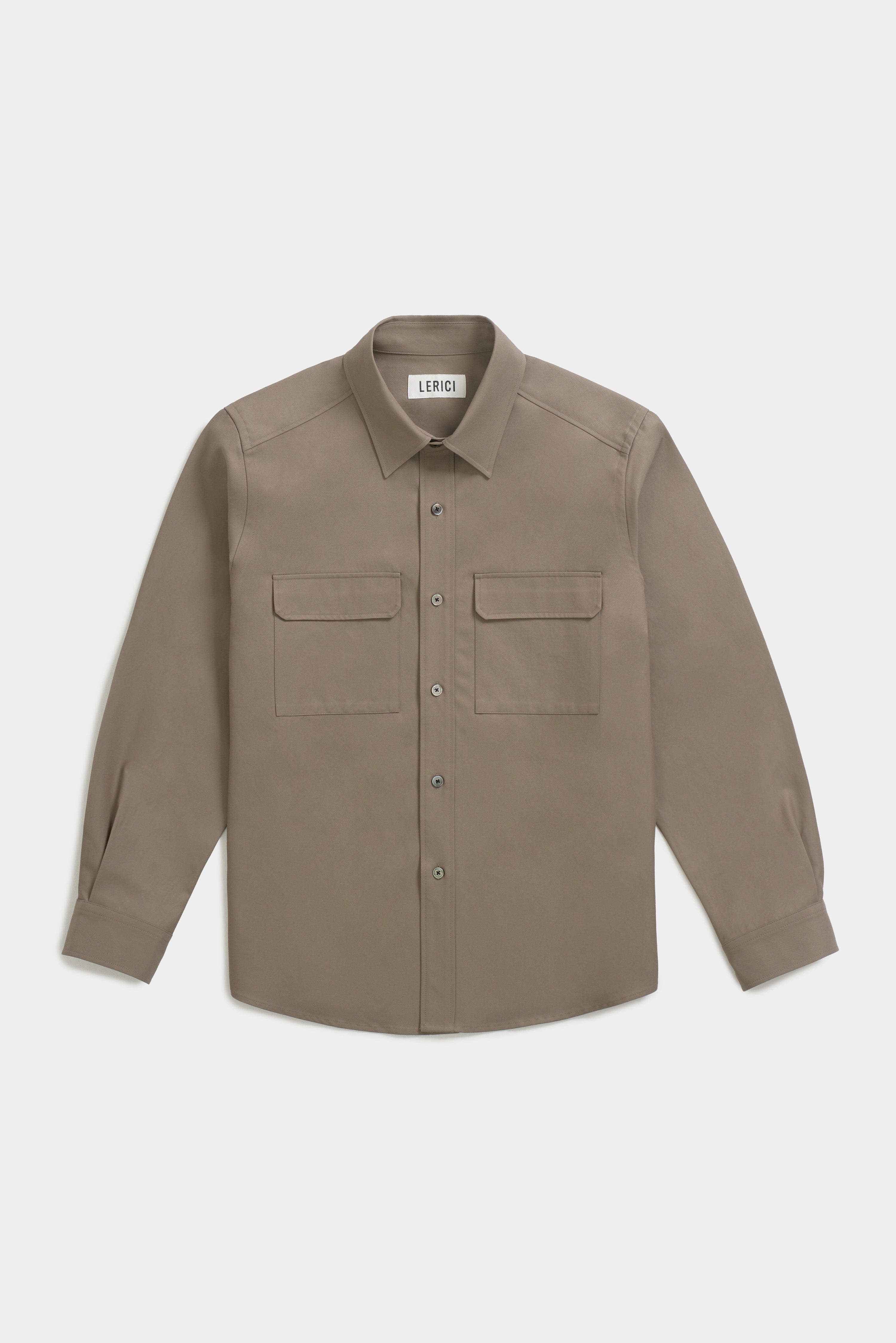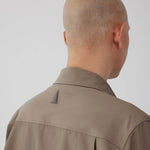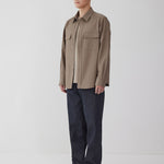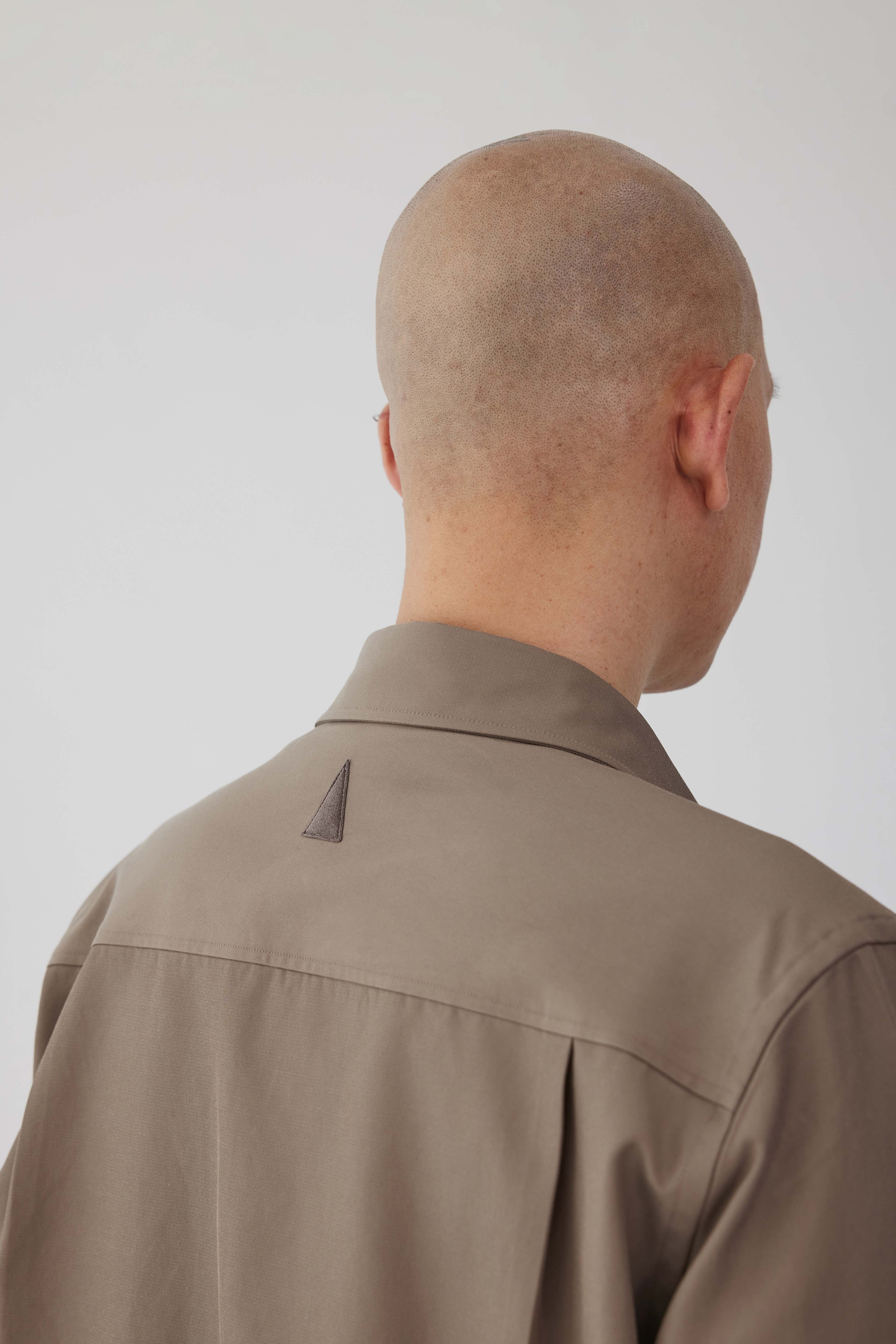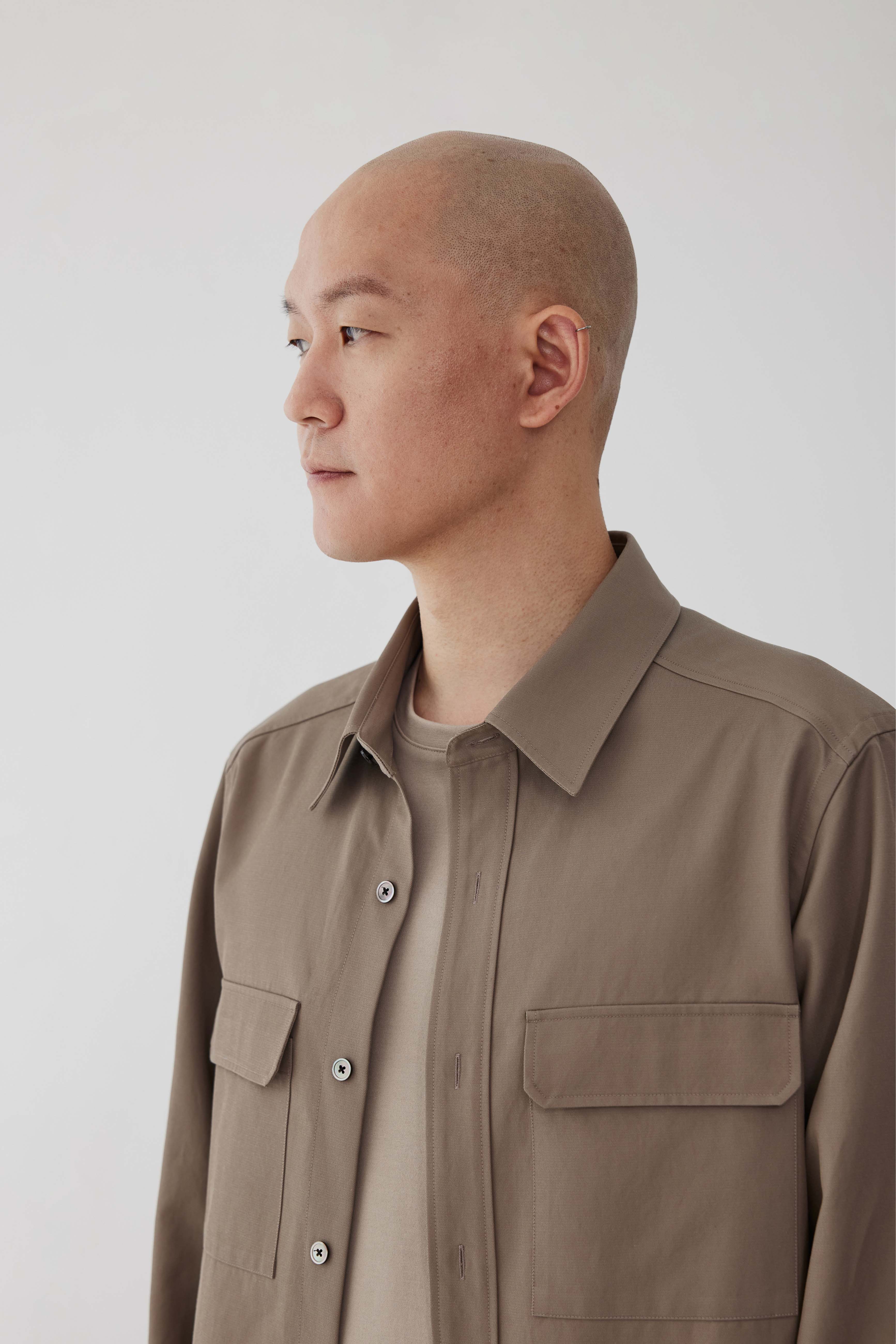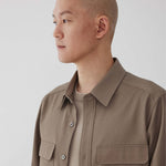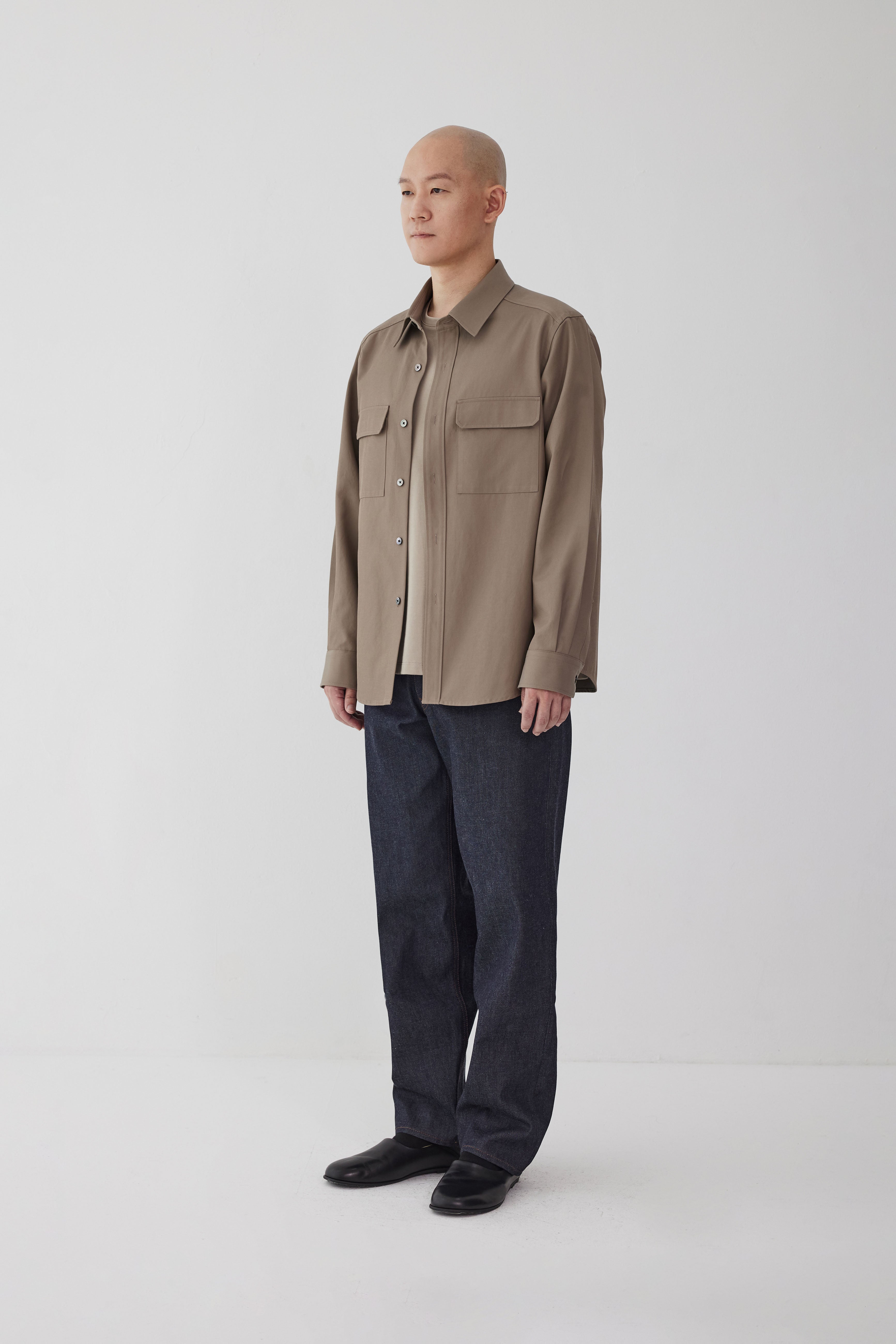 This is a two-pocket work shirt that can be worn comfortably without a waistline. It is made of high-density cotton with a solid texture and finished with mother-of-pearl buttons with a subtle sheen. It can be worn both formally and in everyday life.