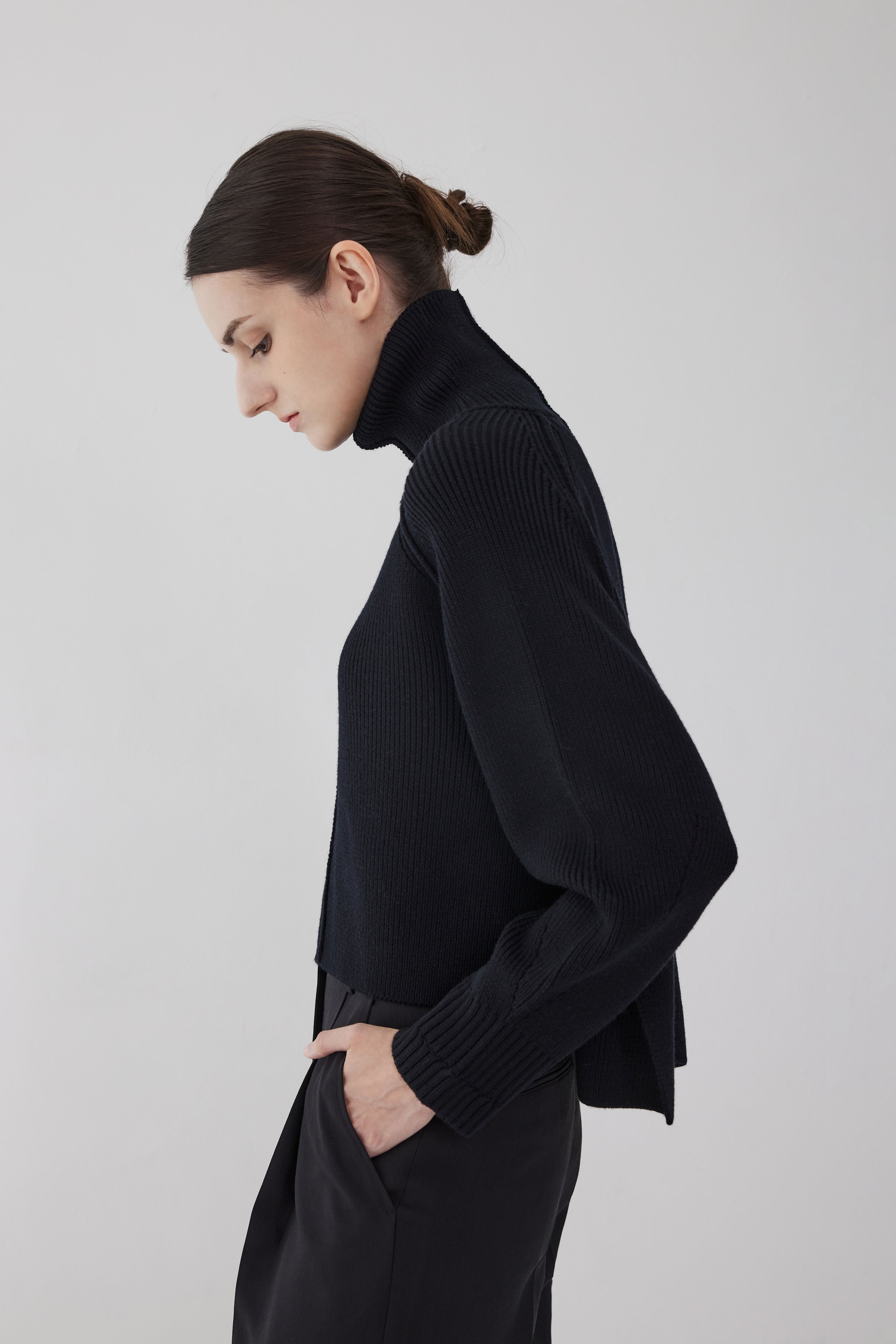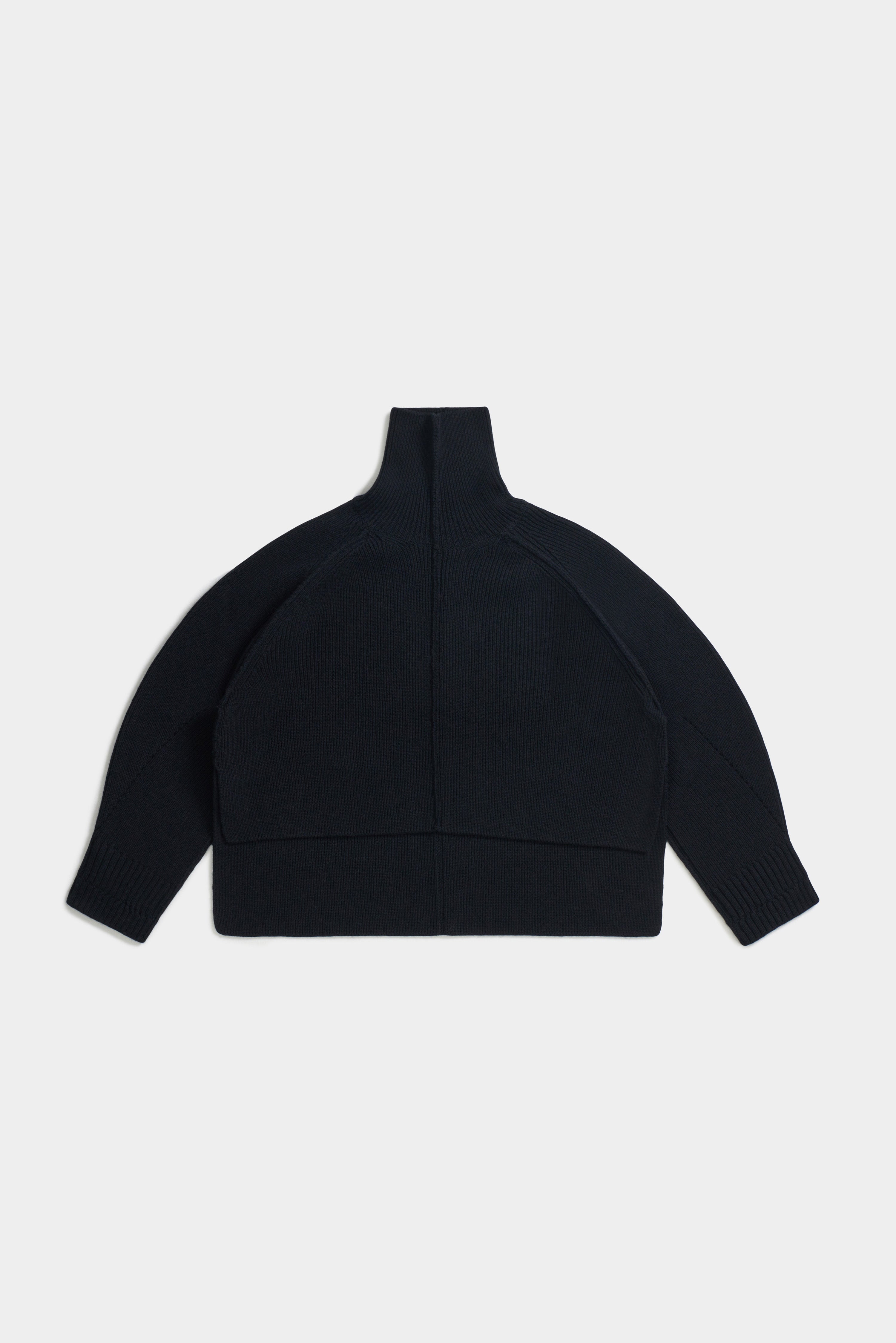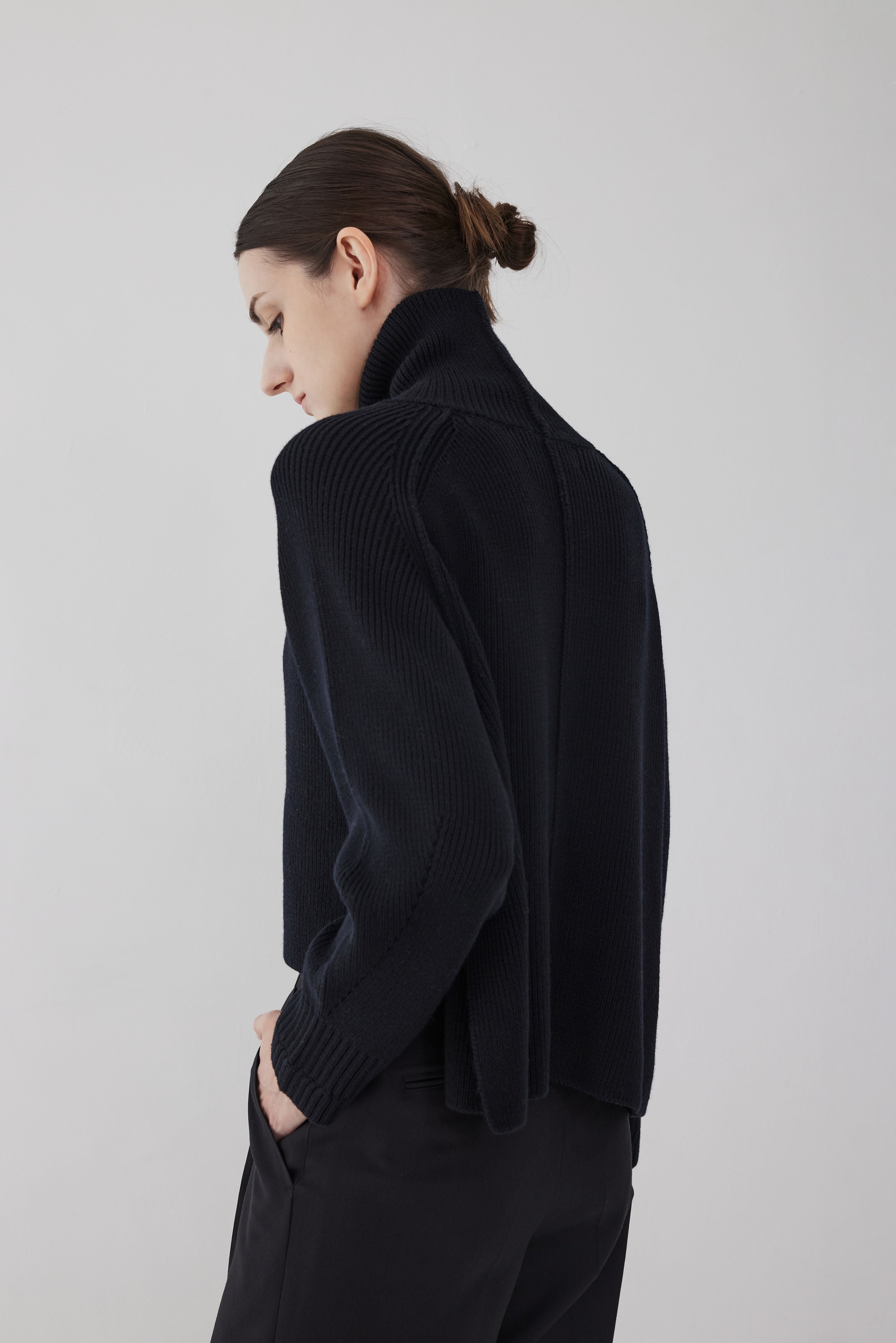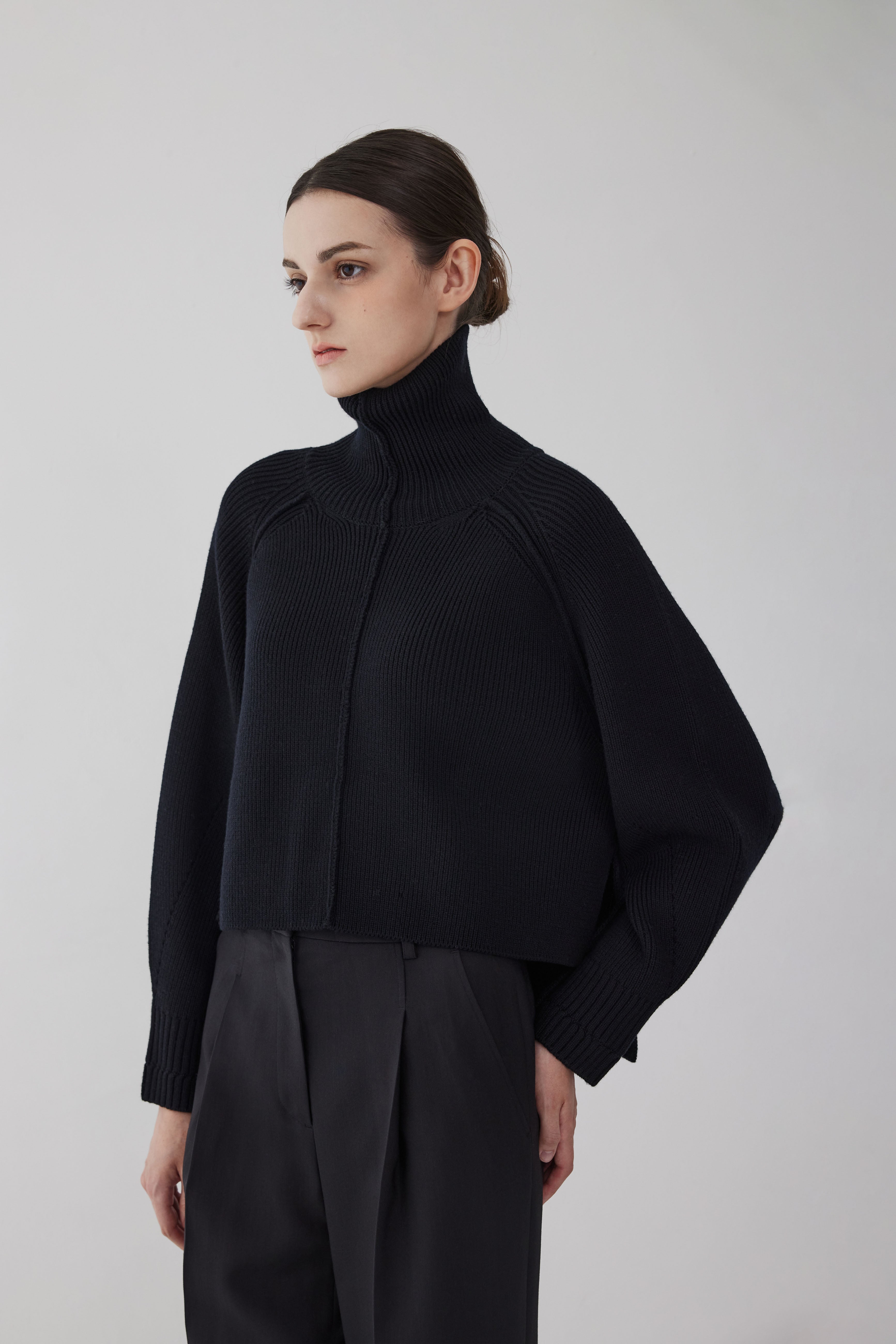 This high-neck sweater is made of merino wool. It is made with a regular fit and features ribbed cuffs and hem. It shows an urban silhouette that wraps the body softly and comfortably. It can be matched with Lerici's signature winter outerwear.