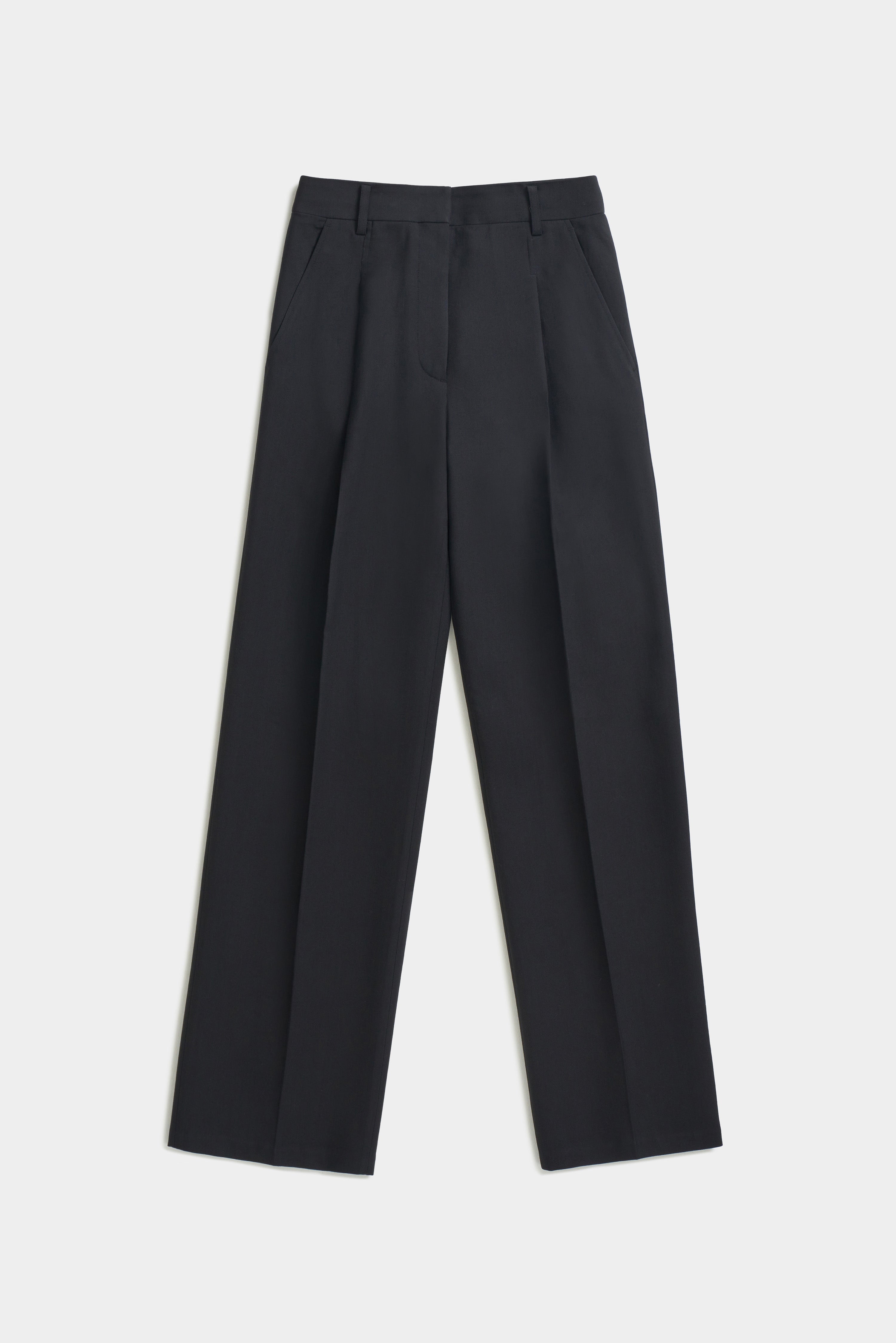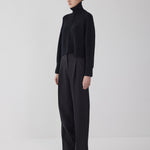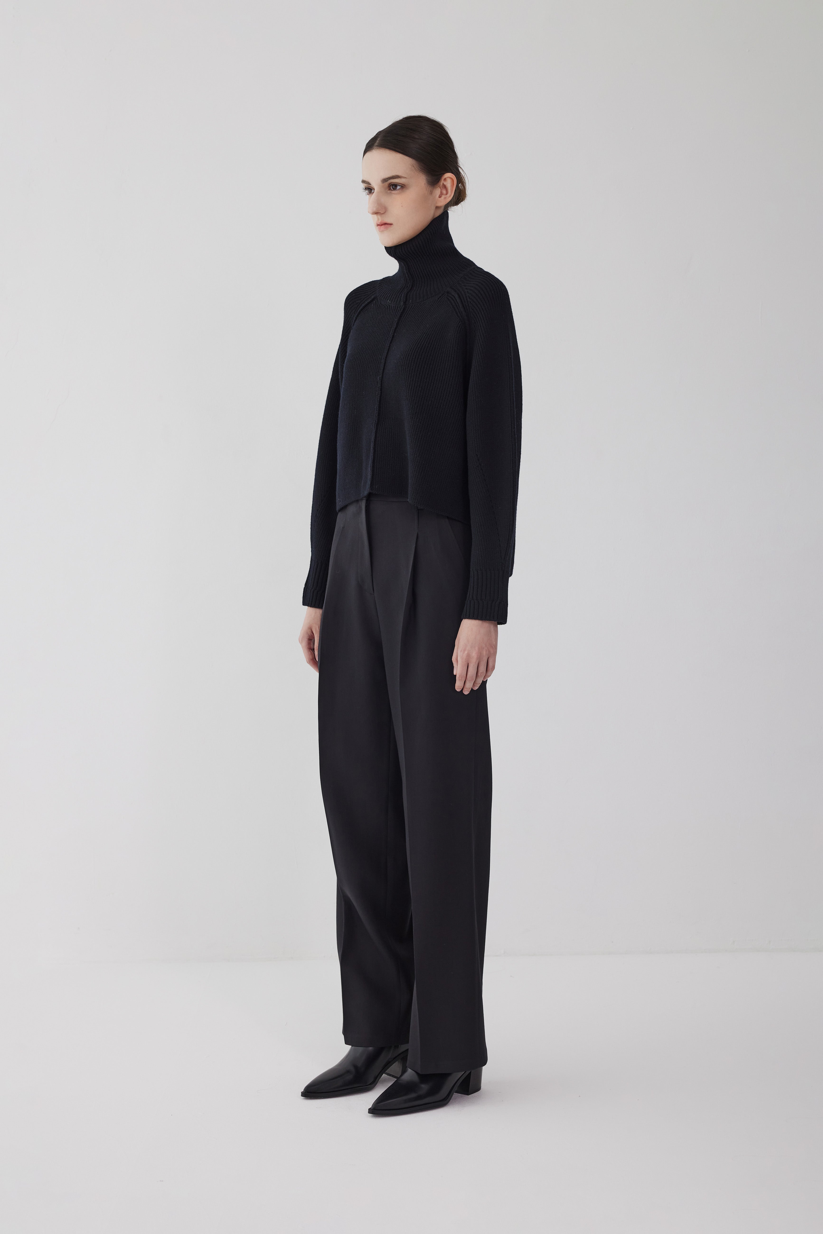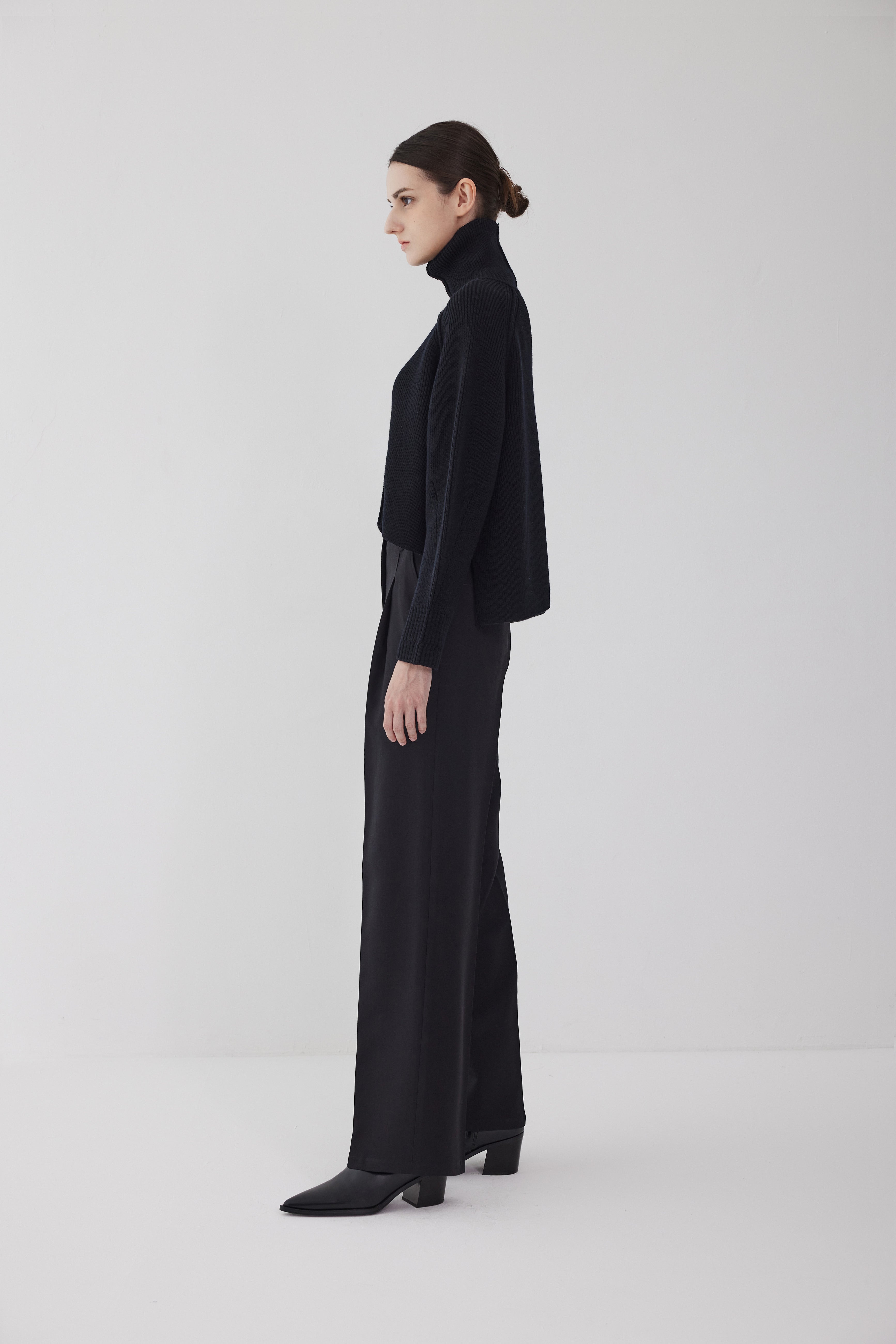 Straight silhouette one-tuck wide pants. The fabric expresses the softness of wool and the depth of silk well. The double-faced structure of the fabric maintains a neat shape without wrinkles for a long time, and can be worn warmly even in winter. The neat wide pants can be used anytime, from everyday to weekends, as they go well with both formal and casual looks. They match beautifully with Lerici women's shirts, including the AP 301 turtleneck and the AP 303 The Chesterfield.