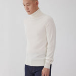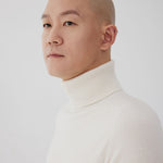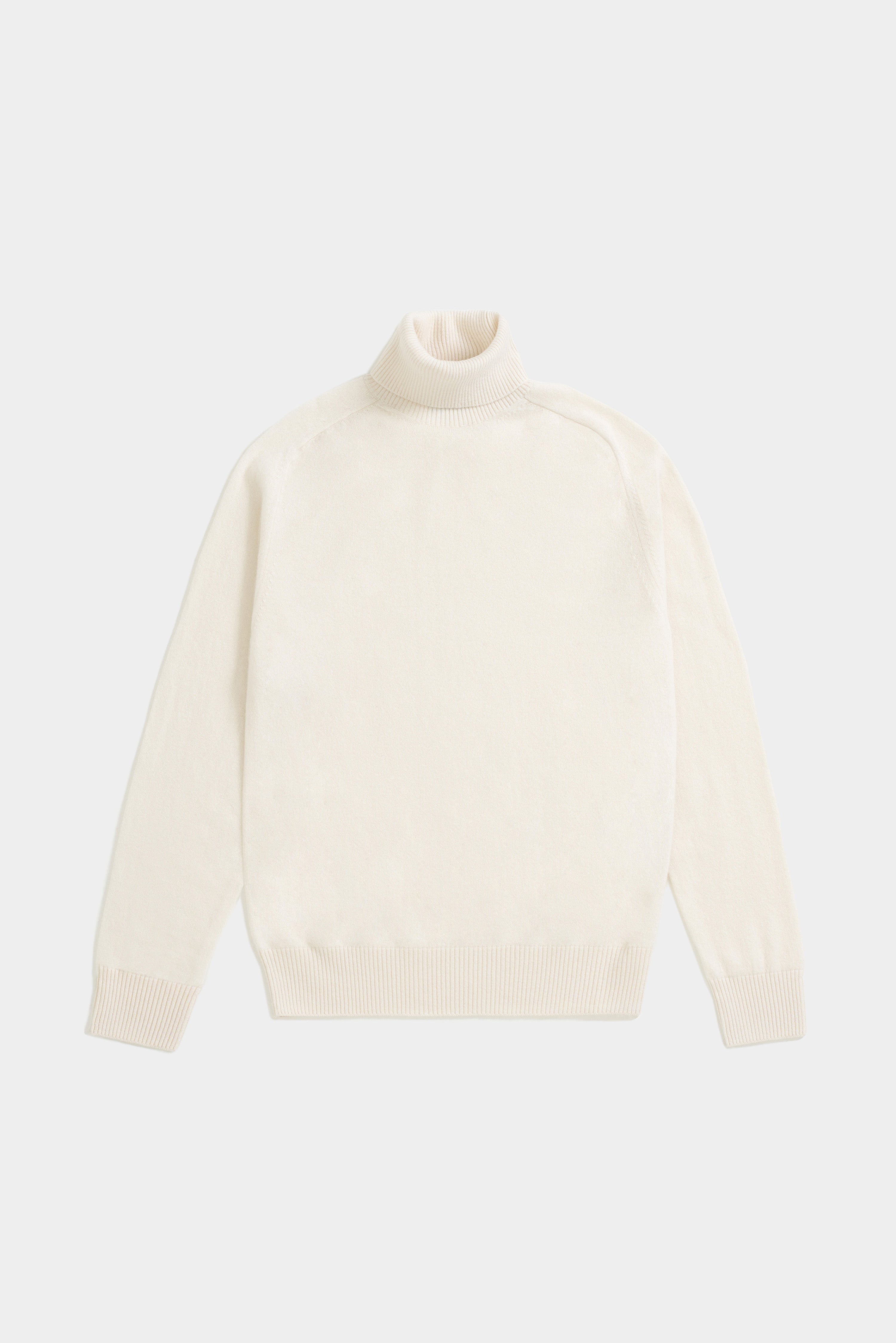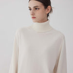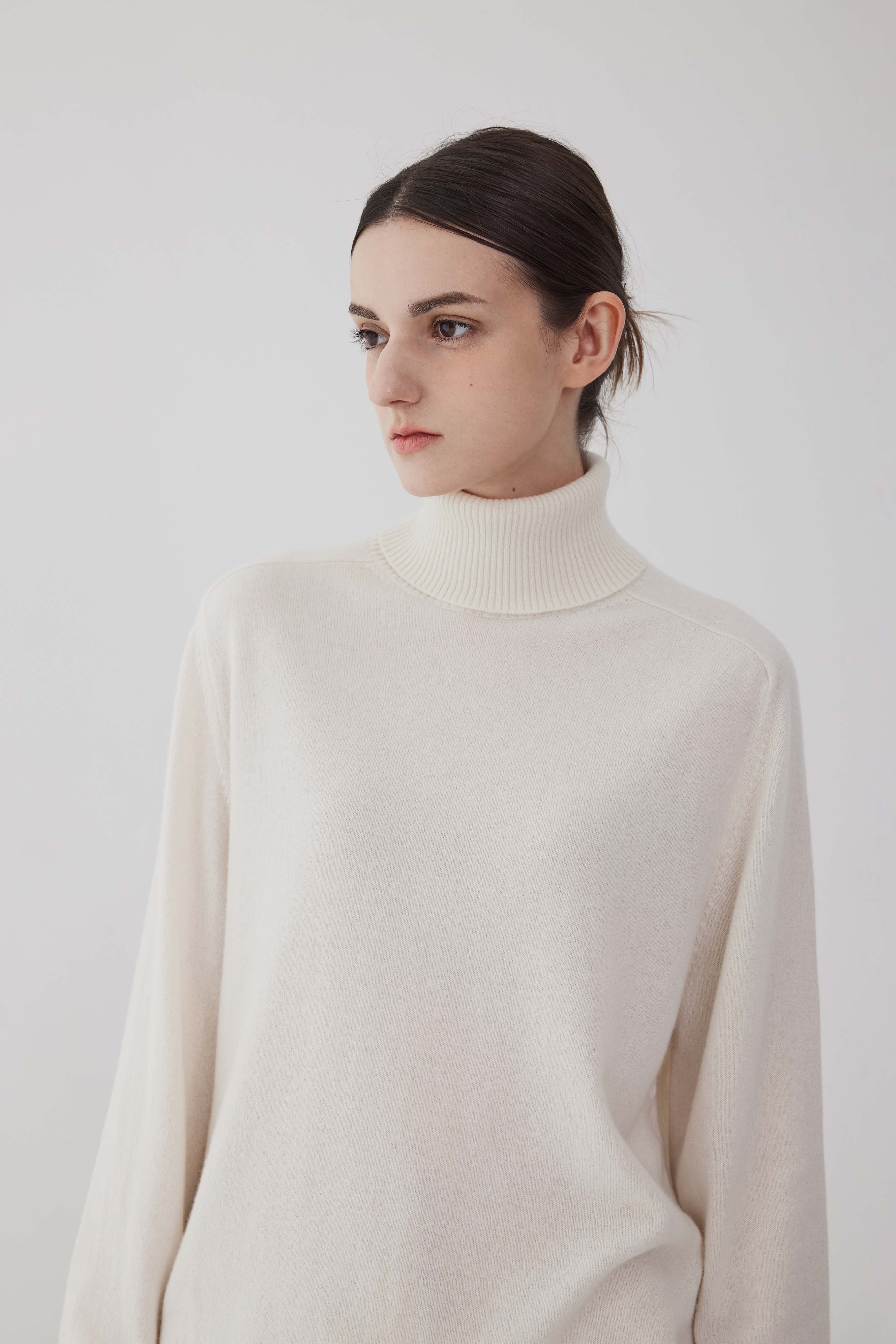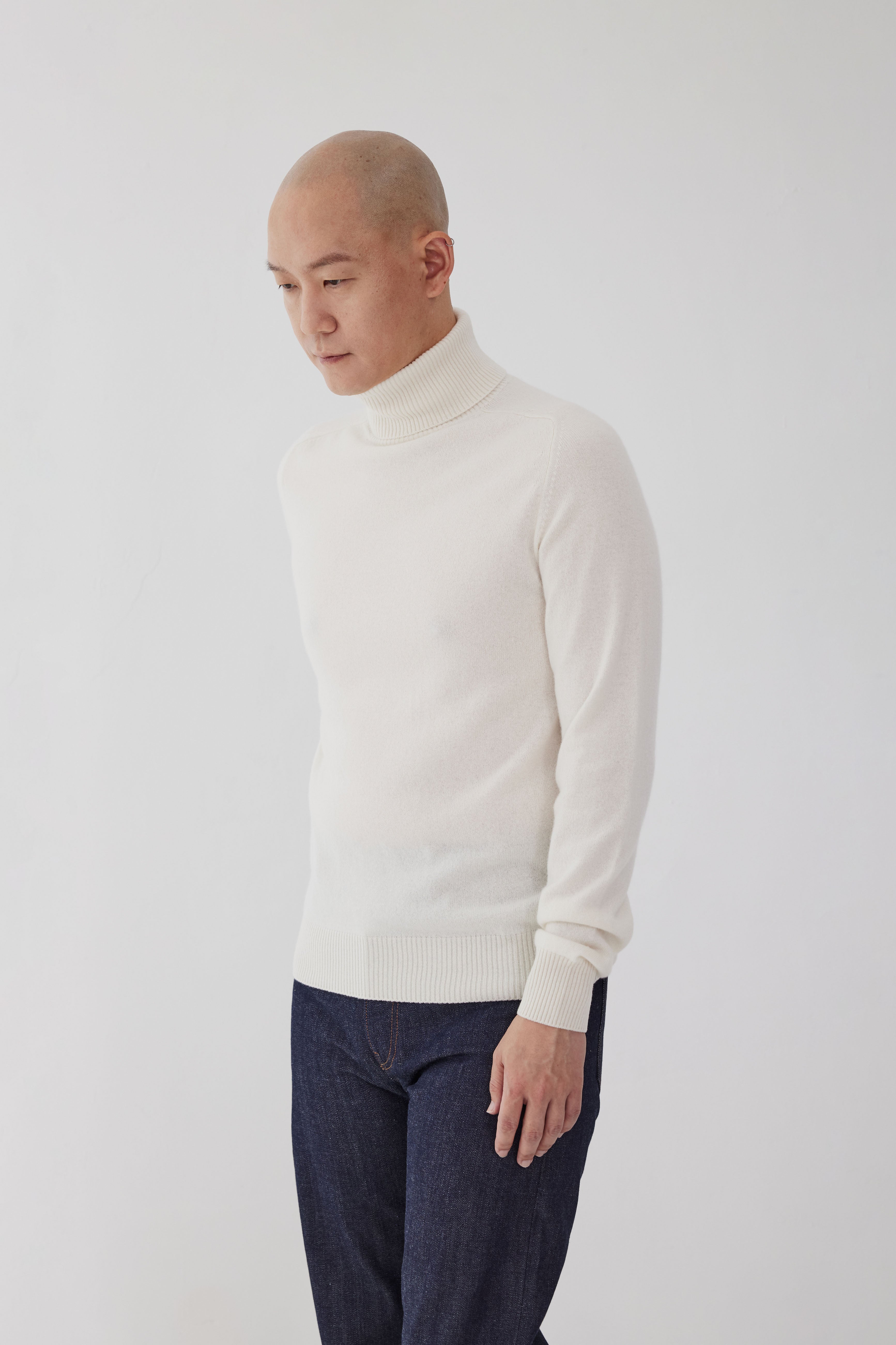 This is a turtleneck sweater made of 100% cashmere. You can feel the soft texture that the highest quality cashmere provides. It has a standard fit that wraps around the body and matches well with any clothes. The teal color is a color that is only applied to turtleneck sweater products and is a point when worn with dark outerwear.