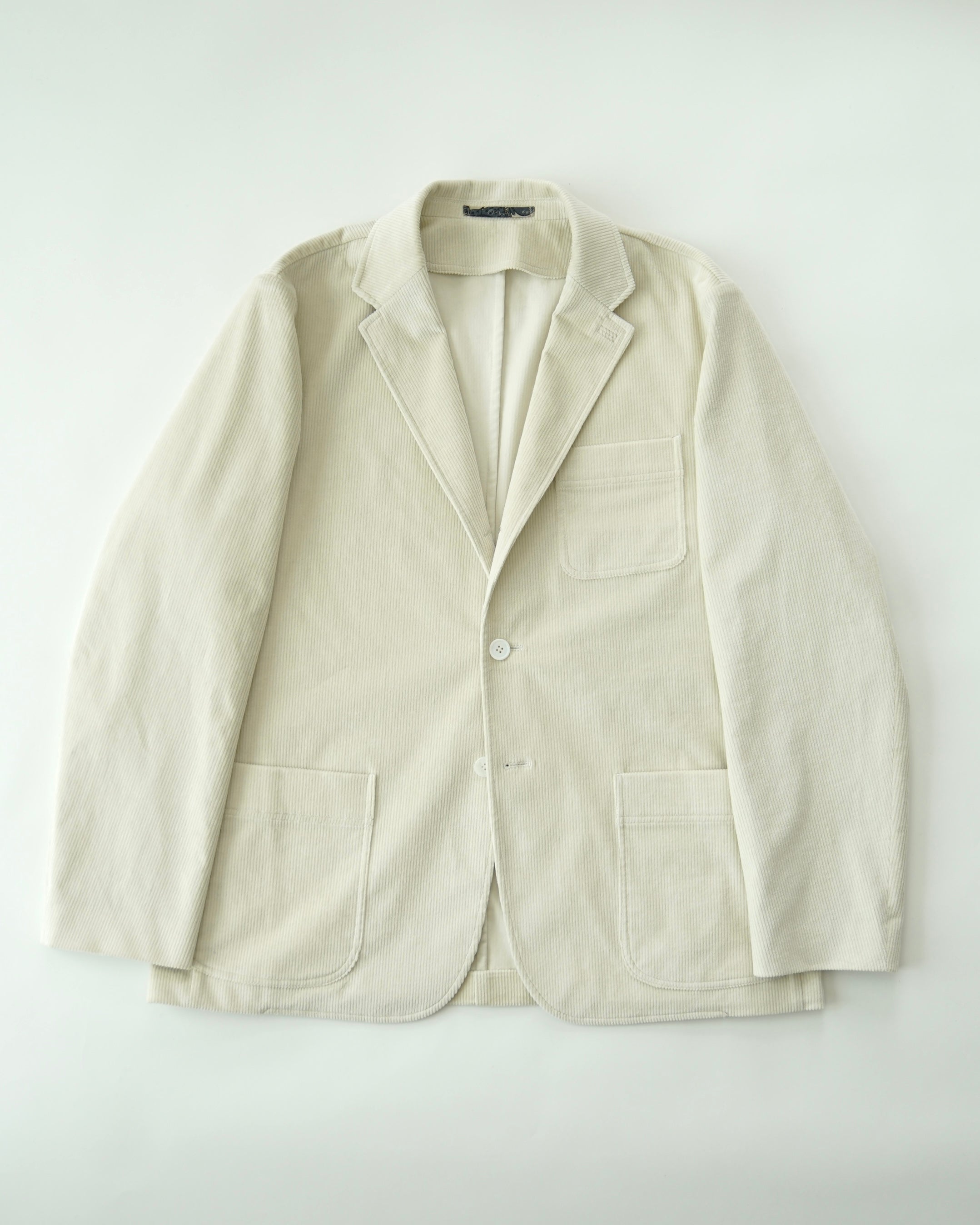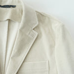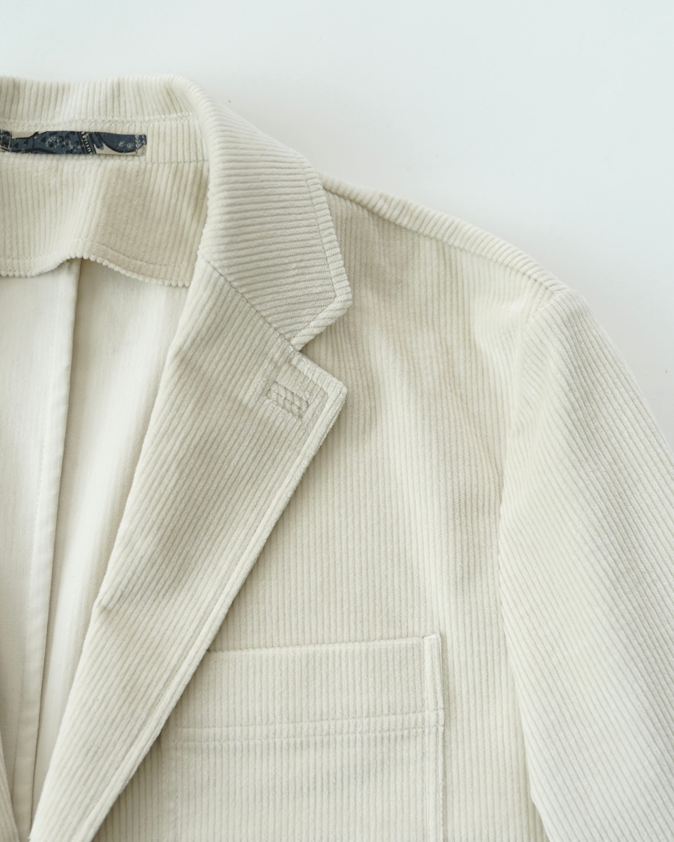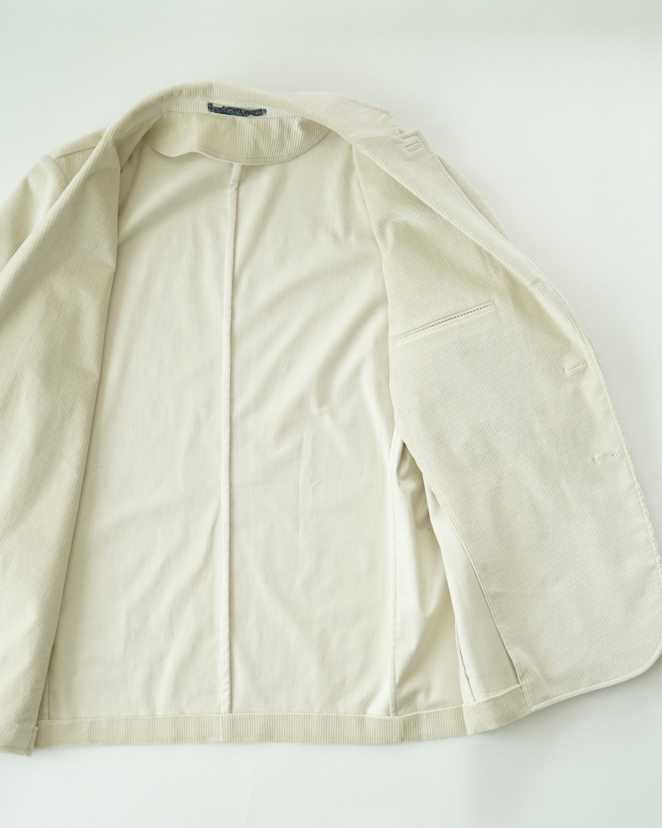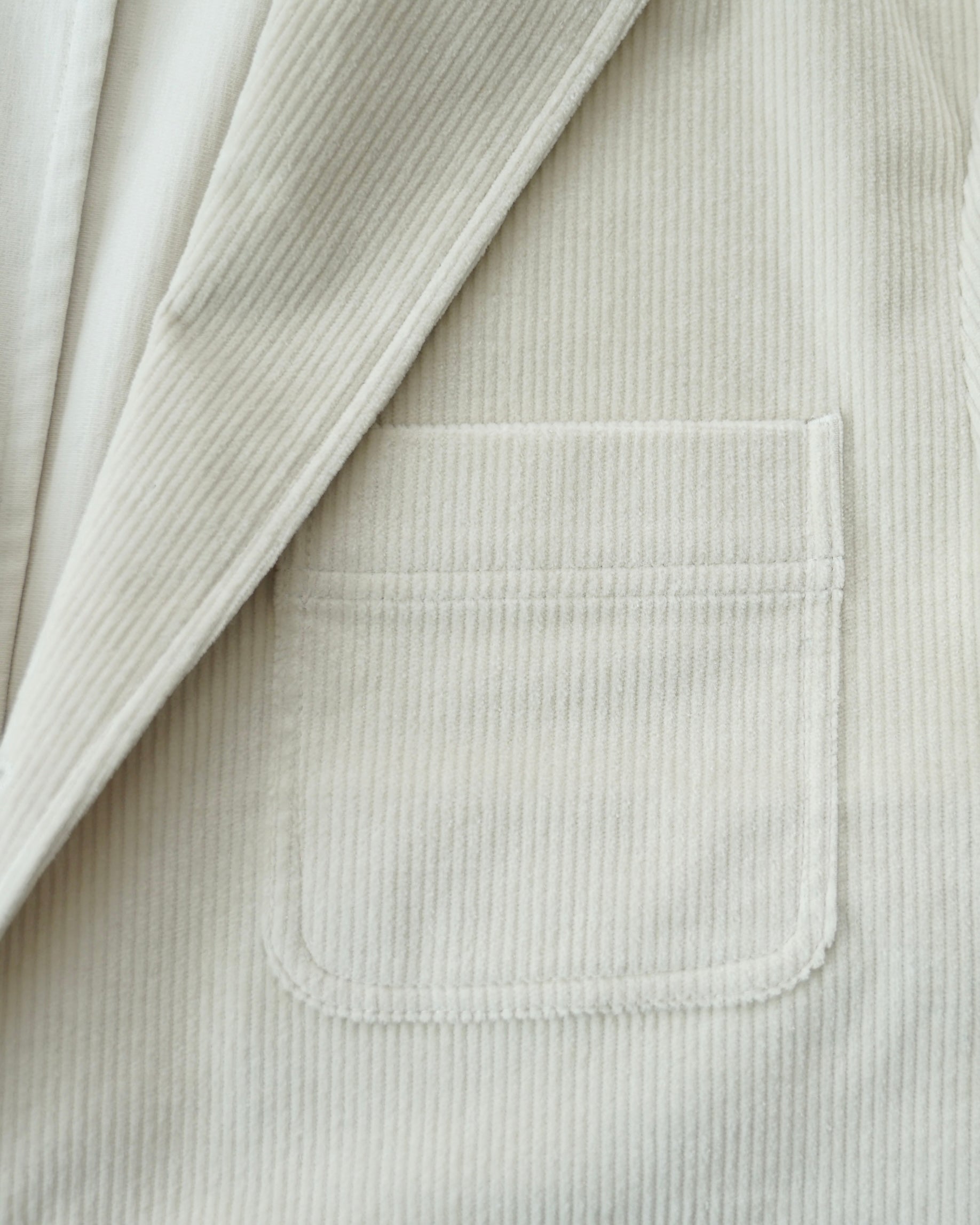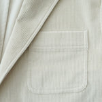 크림색 캐시미어 코튼 코듀로이 원단으로 만든 자켓입니다. 크림 컬러에서는 완성도 높은 원단을 찾기 어렵고, 특히 코듀로이는 더욱 그렇습니다. 이번에 사용한 원단은 보기 드문 높은 등급의 소재로, 캐시미어가 블렌드되어 코듀로이 특유의 단단함이 거의 느껴지지 않습니다. 기모 끝을 미세하게 가공해 살짝 워싱을 준 듯 자연스럽고 부드러운 표면감을 갖고 있습니다.