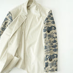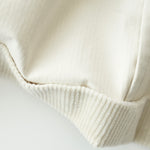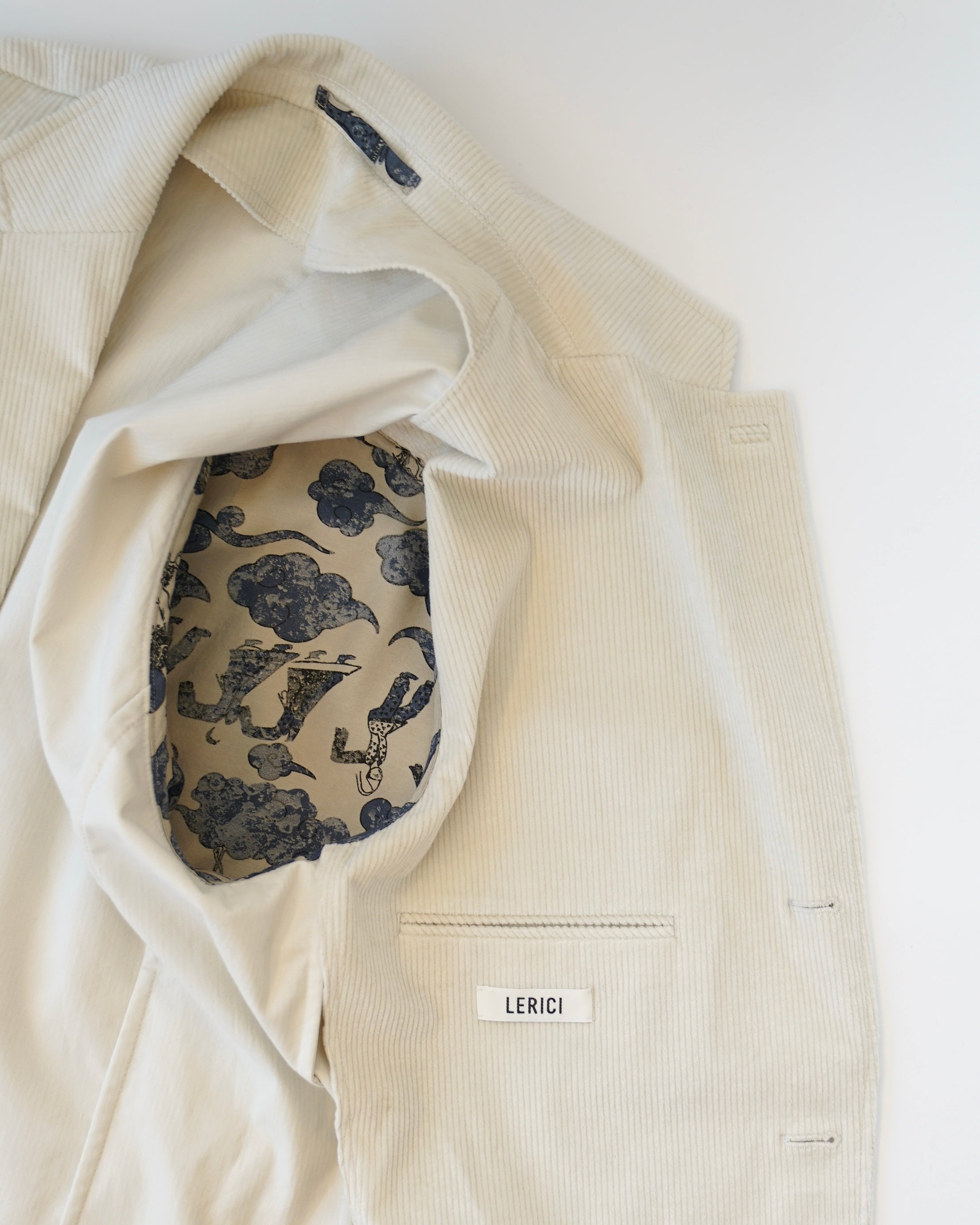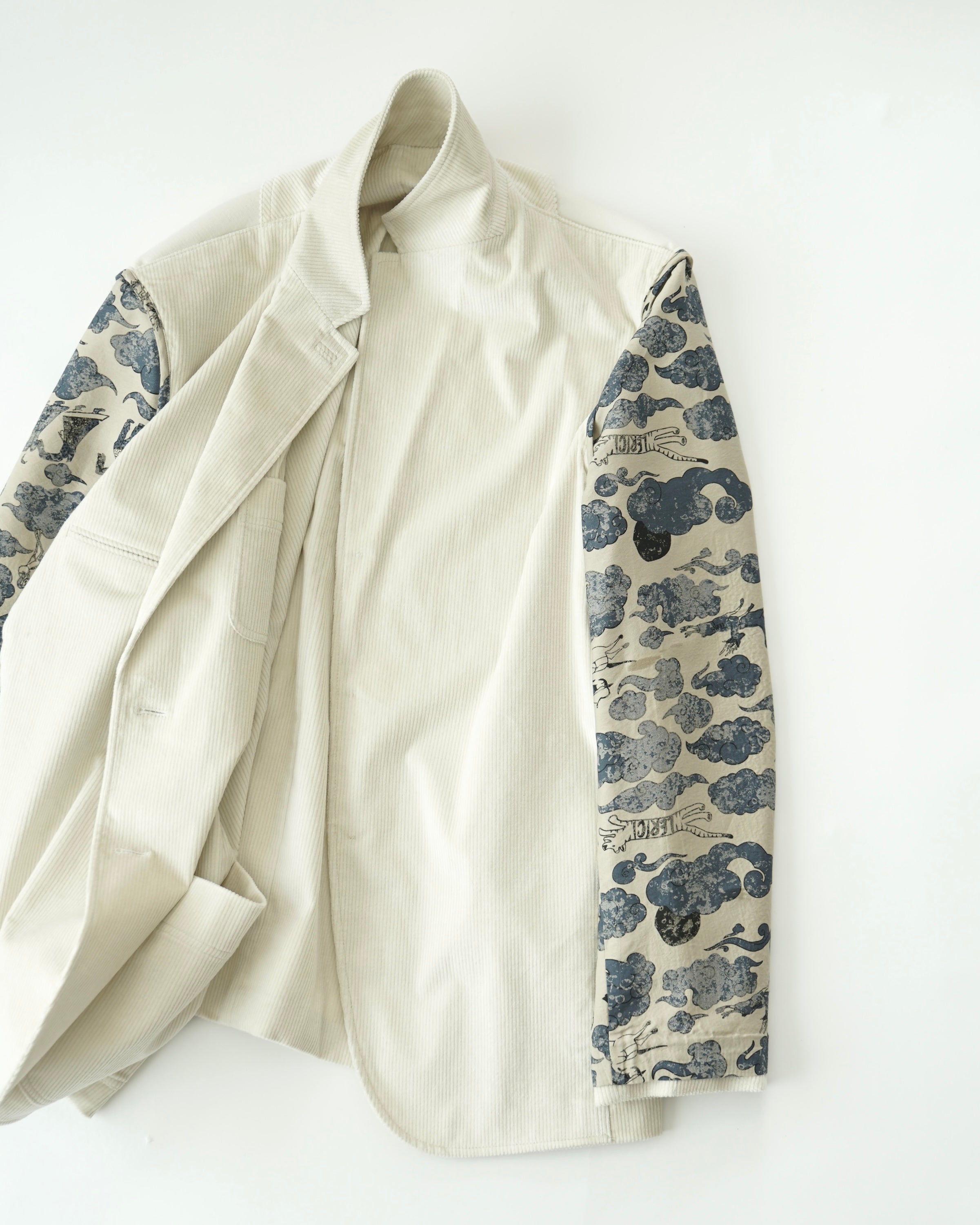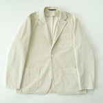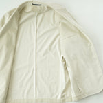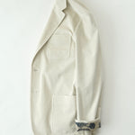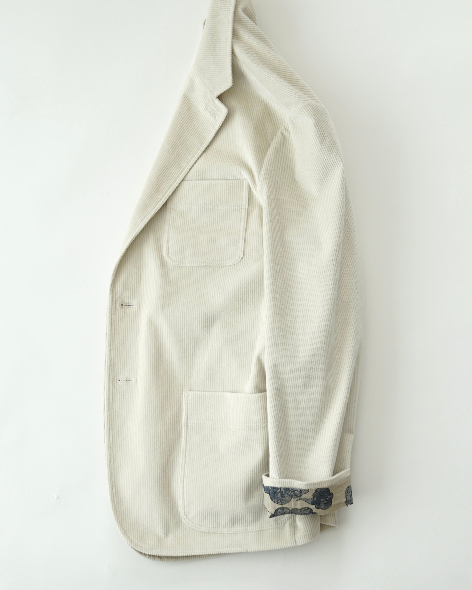 크림색 캐시미어 코튼 코듀로이 원단으로 만든 자켓입니다. 크림 컬러에서는 완성도 높은 원단을 찾기 어렵고, 특히 코듀로이는 더욱 그렇습니다. 이번에 사용한 원단은 보기 드문 높은 등급의 소재로, 캐시미어가 블렌드되어 코듀로이 특유의 단단함이 거의 느껴지지 않습니다. 기모 끝을 미세하게 가공해 살짝 워싱을 준 듯 자연스럽고 부드러운 표면감을 갖고 있습니다.