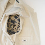 실루엣은 레리치의 테일러링 감각을 바탕으로 편안하게 완성했습니다. 어깨에서 떨어지는 소매선이 자연스럽게 흐르고, 허리를 조이지 않으며 부드럽게 감싸는 형태입니다. 구조적인 심지를 사용하지 않고 앞판을 두 겹으로 제작해 자연스러운 드레이프감을 만들었으며, 나머지 부분은 안감 없이 마감해 가벼운 인상을 더했습니다. 밑단은 바느질로 정리해 마무리의 완성도를 높였습니다.