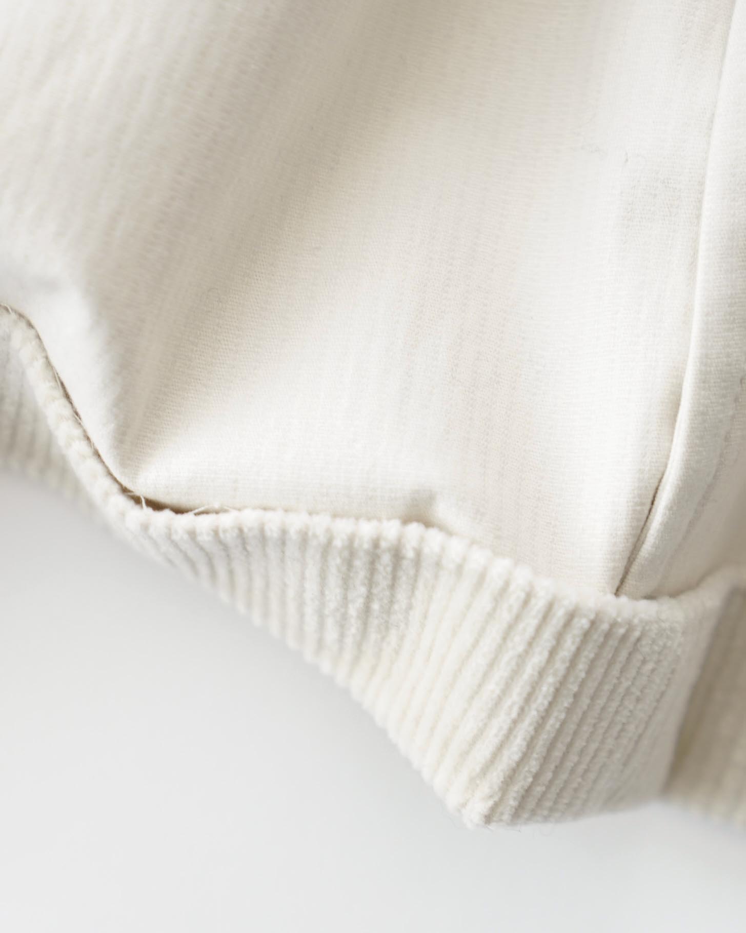 크림색 캐시미어 코튼 코듀로이 원단으로 만든 자켓입니다. 크림 컬러에서는 완성도 높은 원단을 찾기 어렵고, 특히 코듀로이는 더욱 그렇습니다. 이번에 사용한 원단은 보기 드문 높은 등급의 소재로, 캐시미어가 블렌드되어 코듀로이 특유의 단단함이 거의 느껴지지 않습니다. 기모 끝을 미세하게 가공해 살짝 워싱을 준 듯 자연스럽고 부드러운 표면감을 갖고 있습니다.